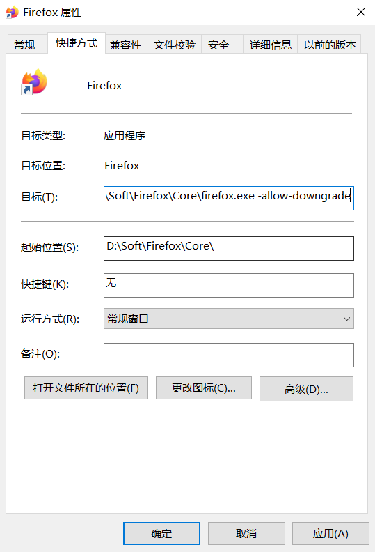 你们一般是直接安装的,右键桌面的 Firefox 图标,点击属性,然后在目标最后加入 -allow-downgrade,变成...\firefox.exe -allow-downgrade(中间有个空格)。