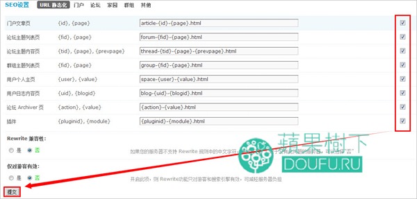 5、选择URL静态化,勾上后,点提交(点击放大)。